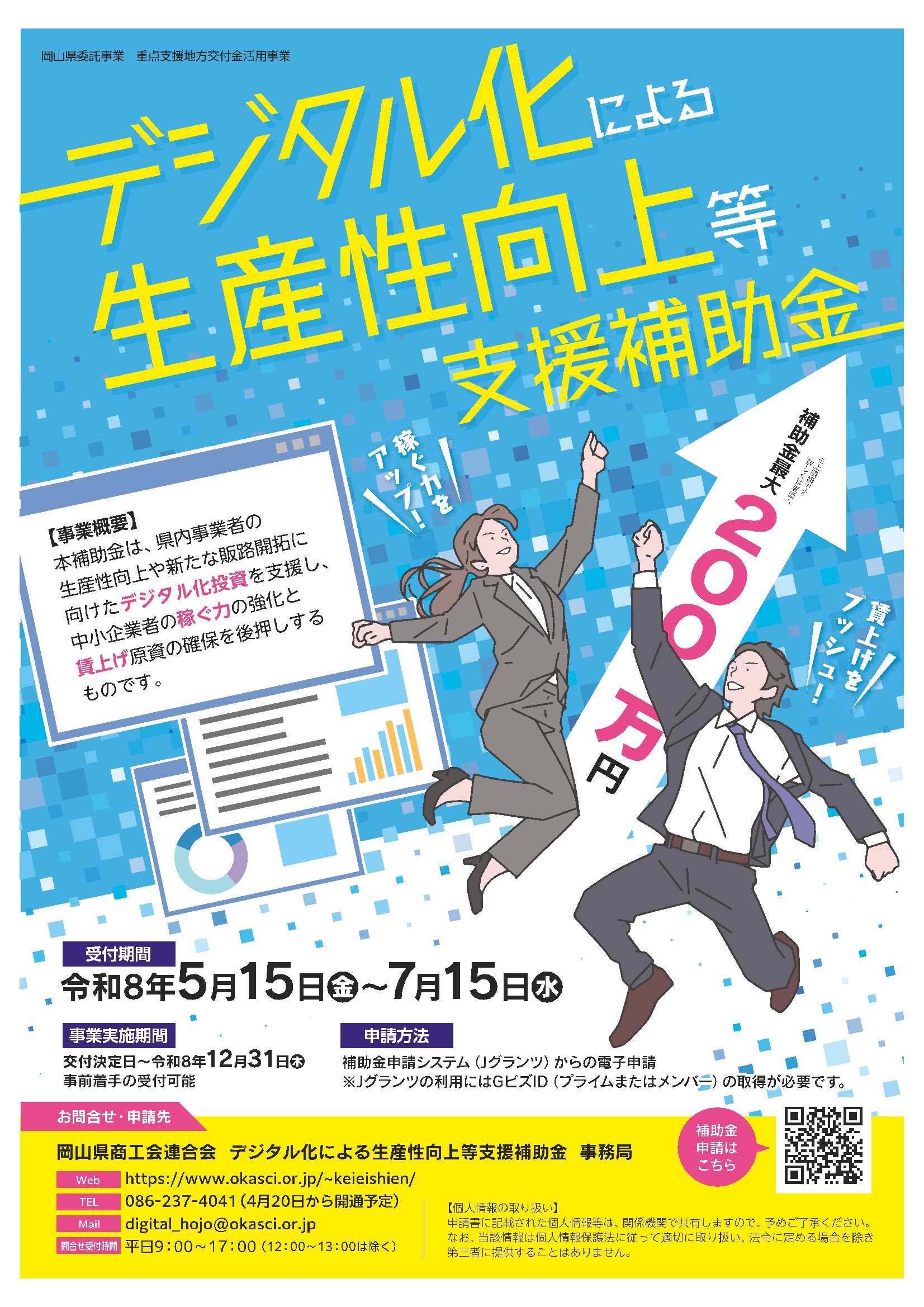 本補助金は、岡山県内事業者の生産性向上や新たな販路開拓に向けたデジタル化投資を支援し、中小企業者の稼ぐ力の強化と賃上げ原資の確保を後押しするものです。